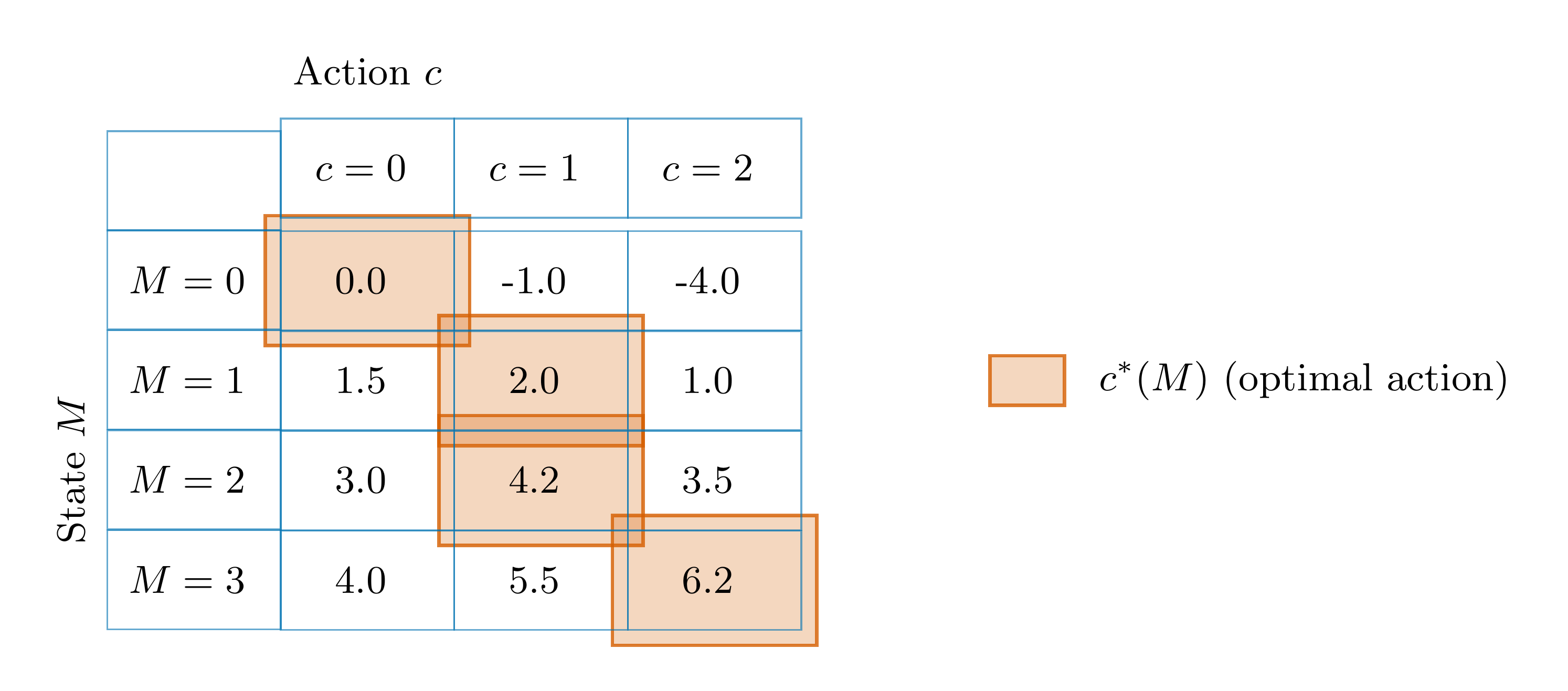 Output: Value \(V(M)\), policy \(c^*(M)\)