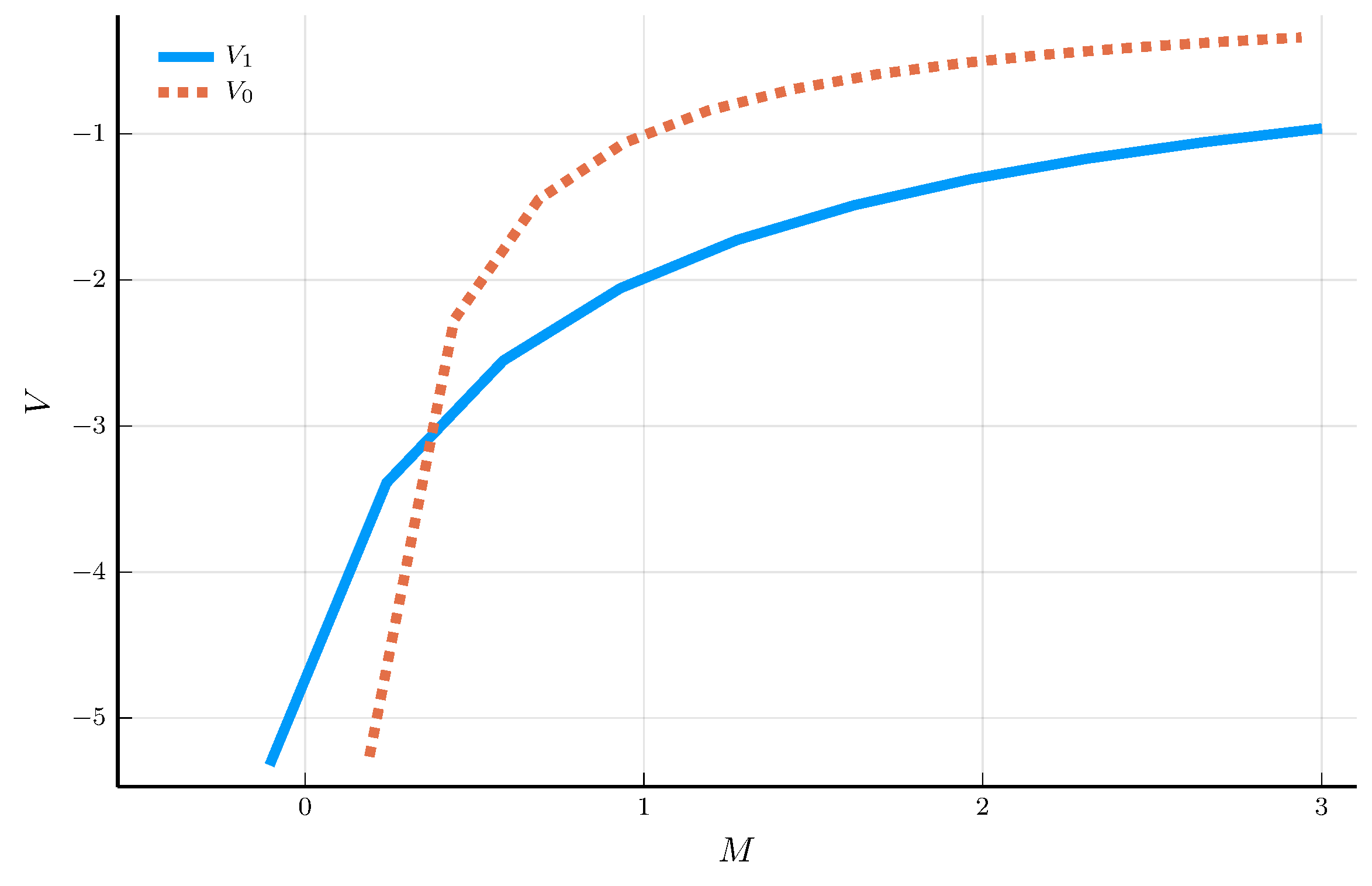 We now solve for \(V_1(M)\) and \(c_1(M)\), given the terminal condition \(V_0(M) = \frac{M^{1-\gamma}}{1-\gamma}\).