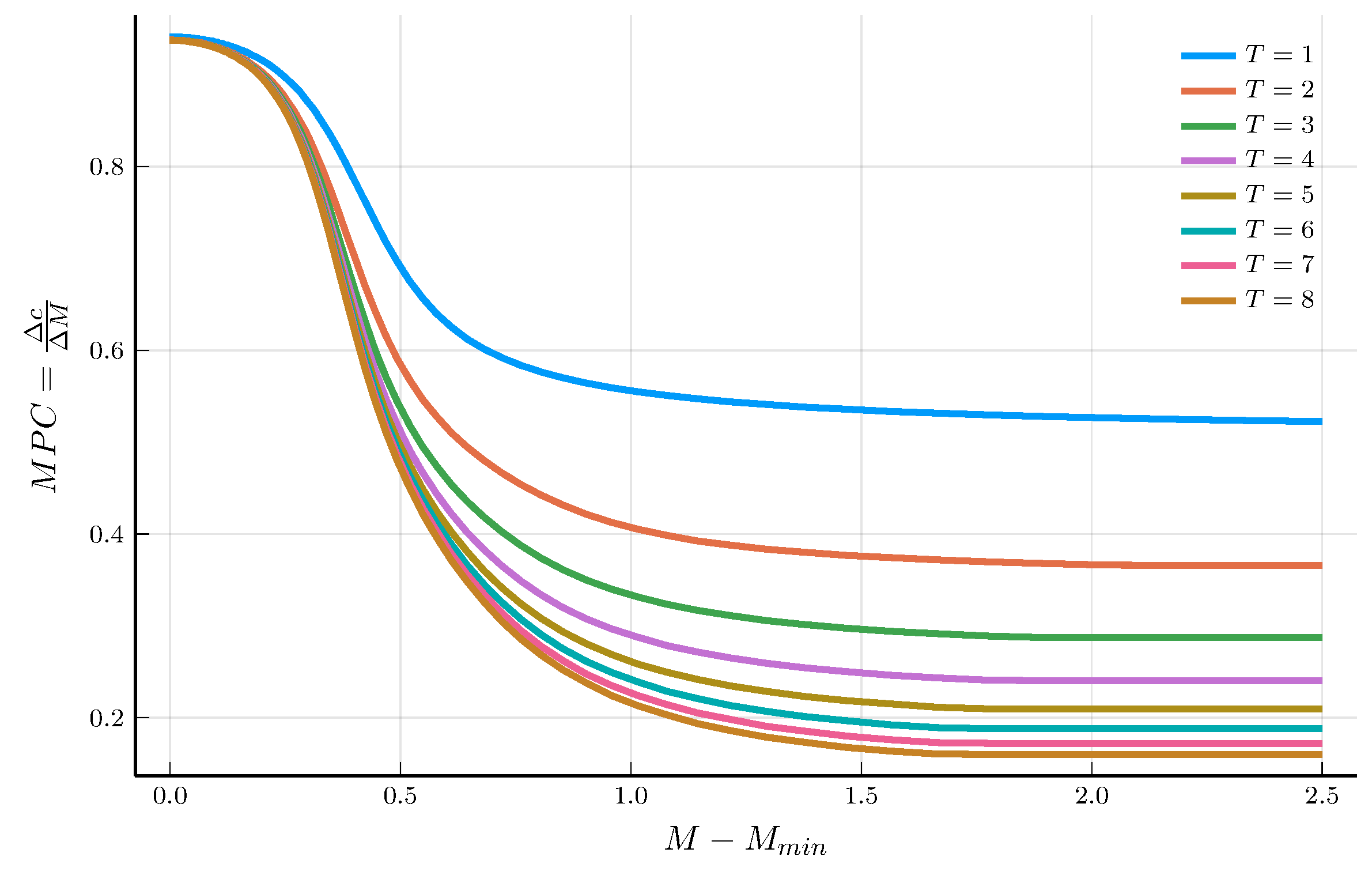Given the policy function \(c_t(M)\), we can obtain the marginal propensity to consume (MPC).