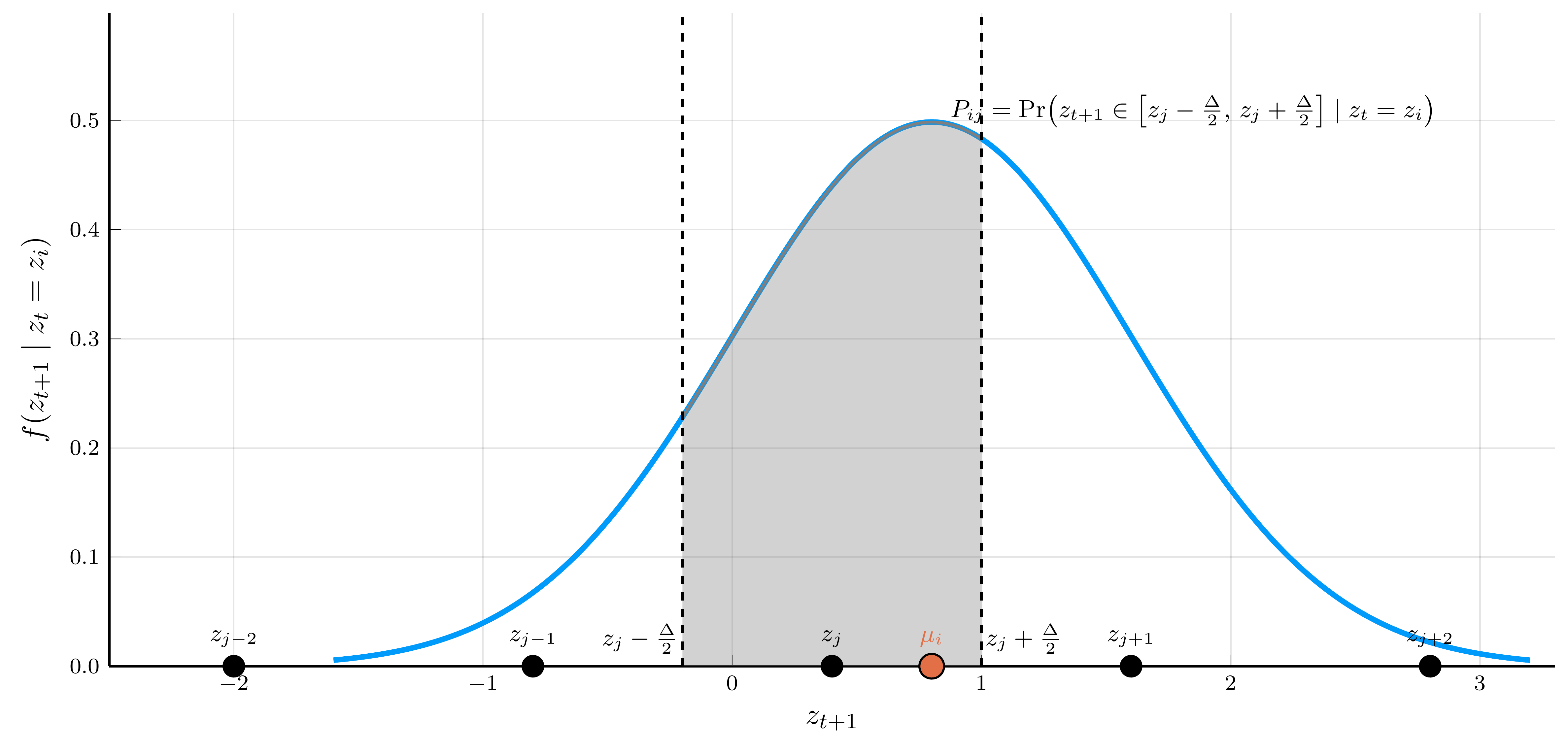 The Tauchen method is a common approach to discretize the process for an AR(1) process: \[ z_{t+1} = \mu + \rho_z (z_t - \mu) + \varepsilon_{t+1}, \qquad \varepsilon_{t+1} \sim \mathcal{N}(0, \sigma_\varepsilon^2), \] where \(|\rho_z| < 1\) and \(\sigma_\varepsilon > 0\) (in our case, \(\rho_z = 0\) and \(\sigma_\varepsilon = \sigma_y\)).