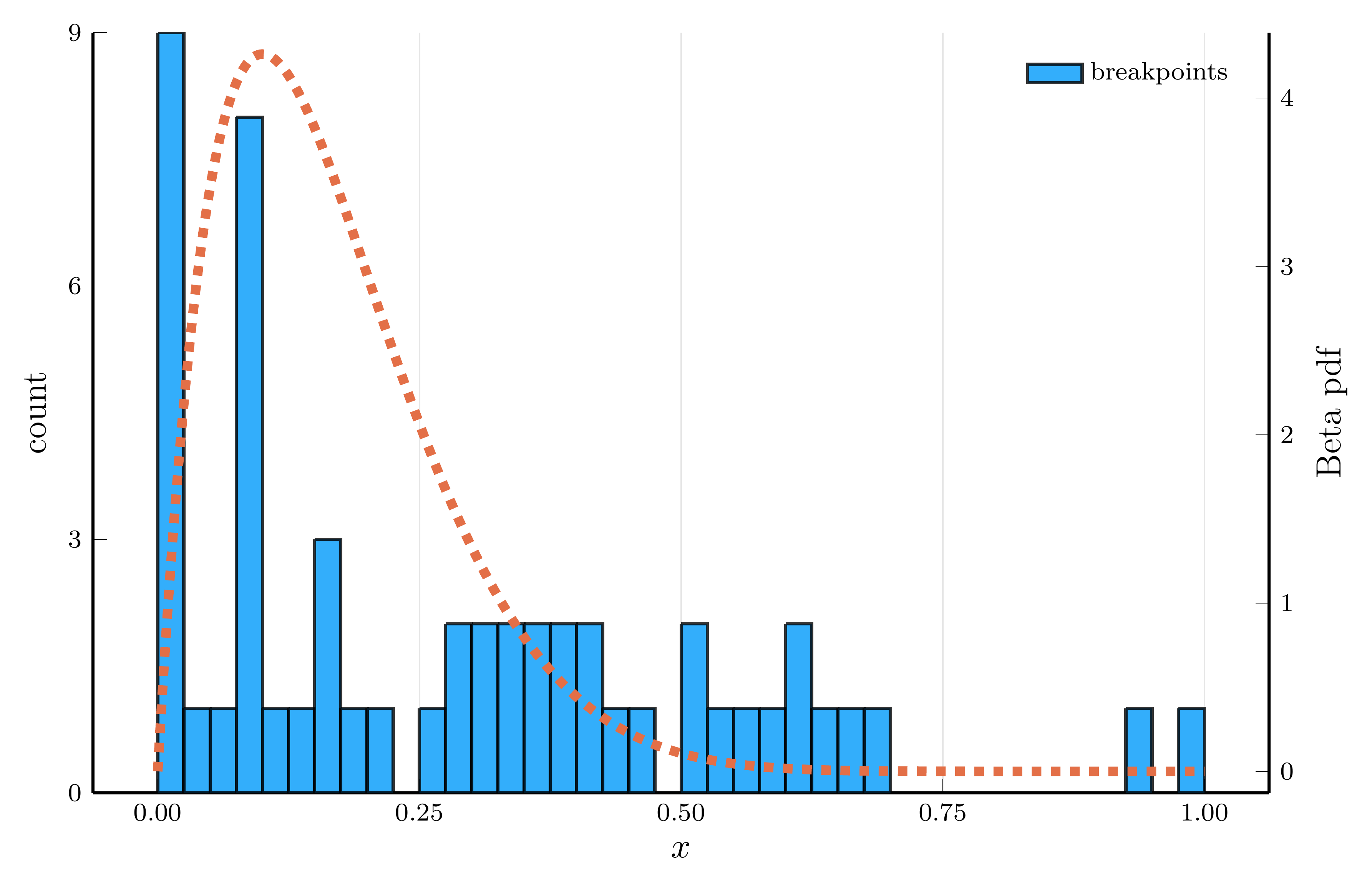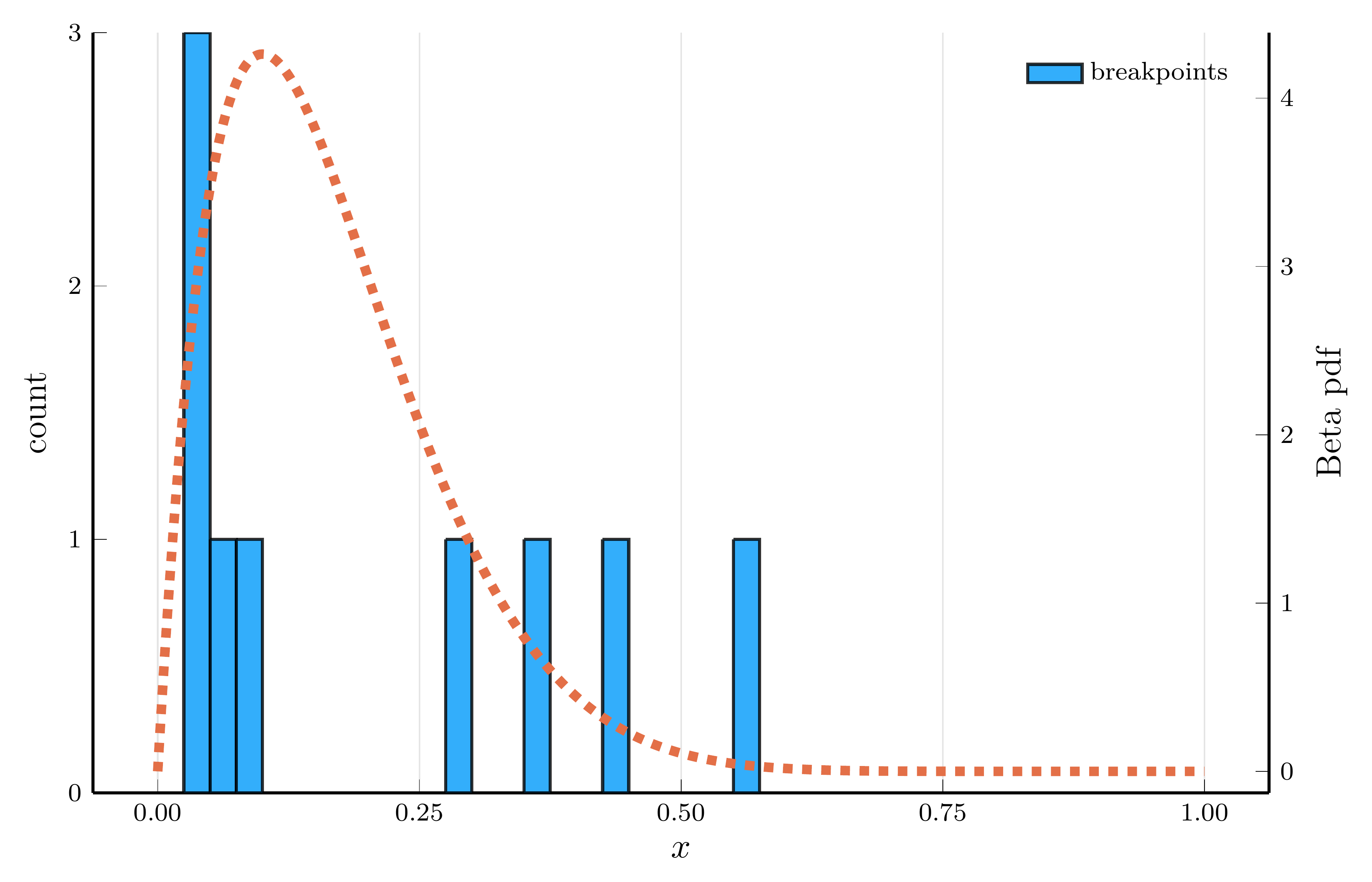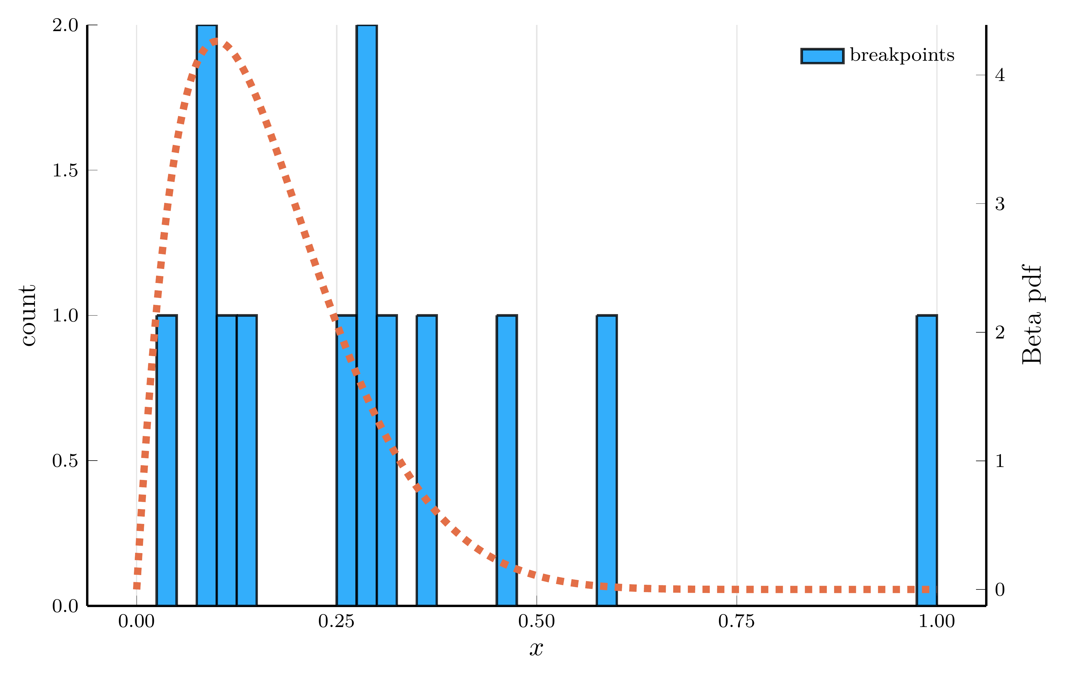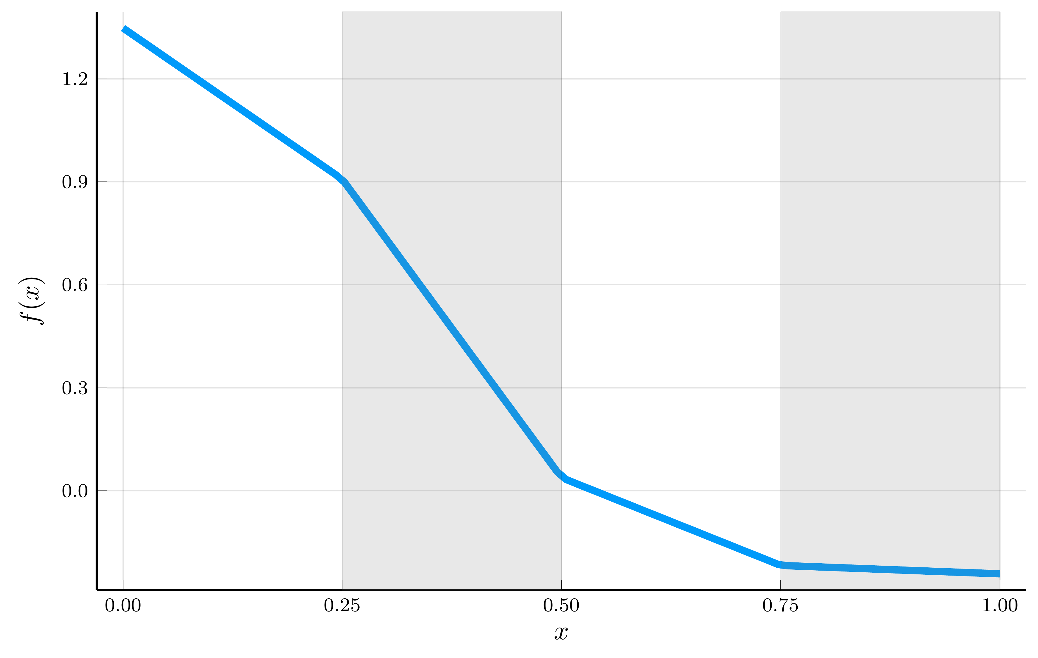 Ordering the breakpoints as \(0 = \hat{x}_0 < \cdots < \hat{x}_{n-1} < 1 \equiv \hat{x}_n\), \[ f(x_i, \theta) = f(\hat{x}_j, \theta) + w_{n,j}(x_i - \hat{x}_j), \qquad x_i \in (\hat{x}_j, \hat{x}_{j+1}], \] with \(f(\hat{x}_0, \theta) = b_n\).