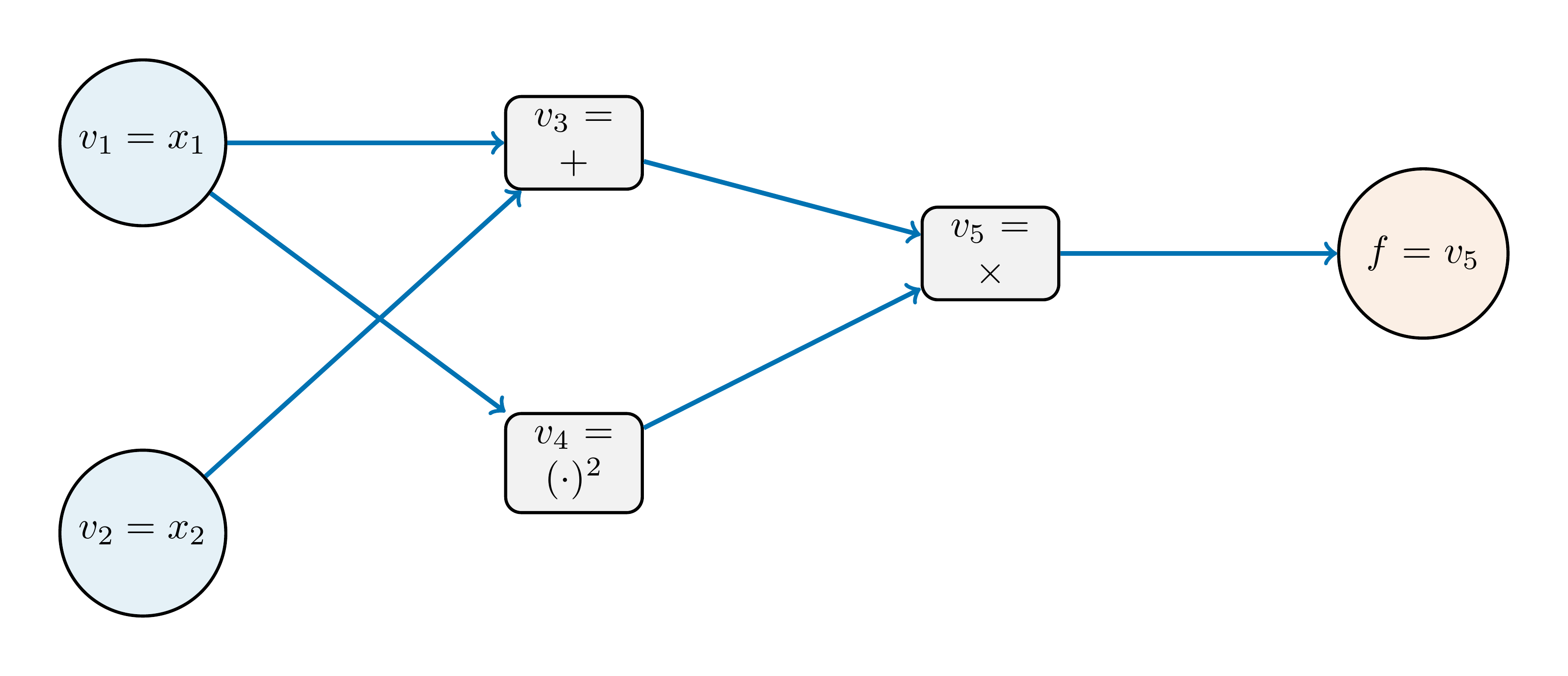 Forward pass: \[ v_1 = x_1, \qquad v_2 = x_2, \qquad v_3 = v_1 + v_2, \qquad v_4 = v_1^2, \qquad v_5 = v_3 v_4. \]