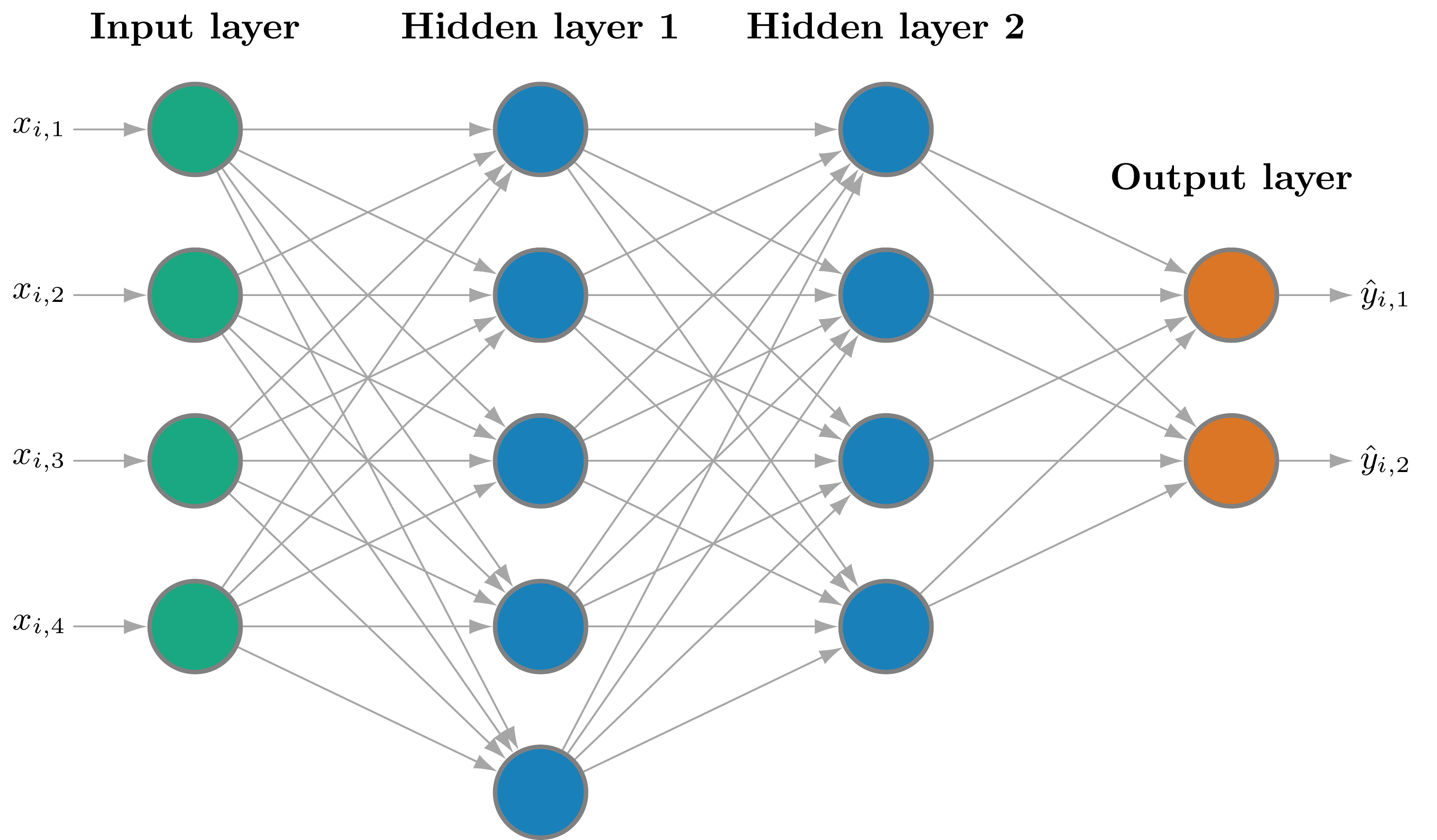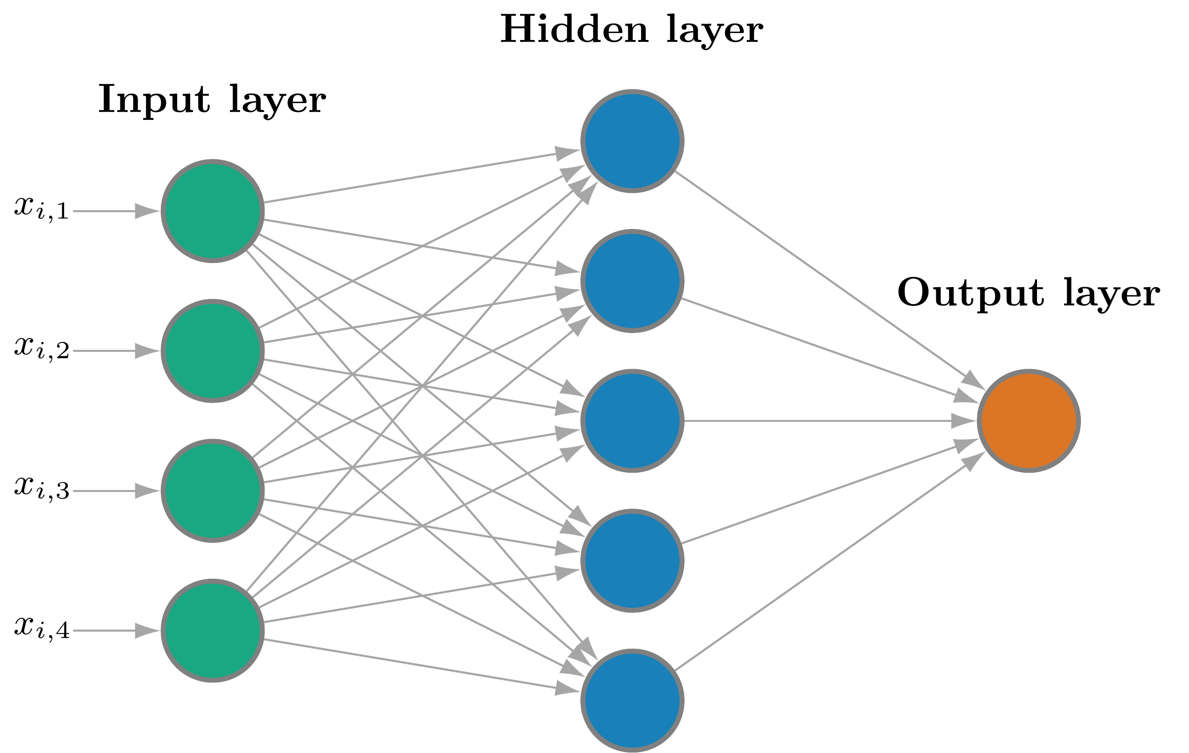 Hidden units: a nonlinear transformations of the inputs. \[ h_j(\mathbf{x}, \mathbf{\theta}_j) = \sigma(\mathbf{w}_j^{\top} \mathbf{x} + b_j), \qquad j = 0, \ldots, n-1 \] where \(\sigma\) is an activation function, \(\mathbf{\theta}_j = (\mathbf{w}_j^{\top}, b_j)^{\top}\).