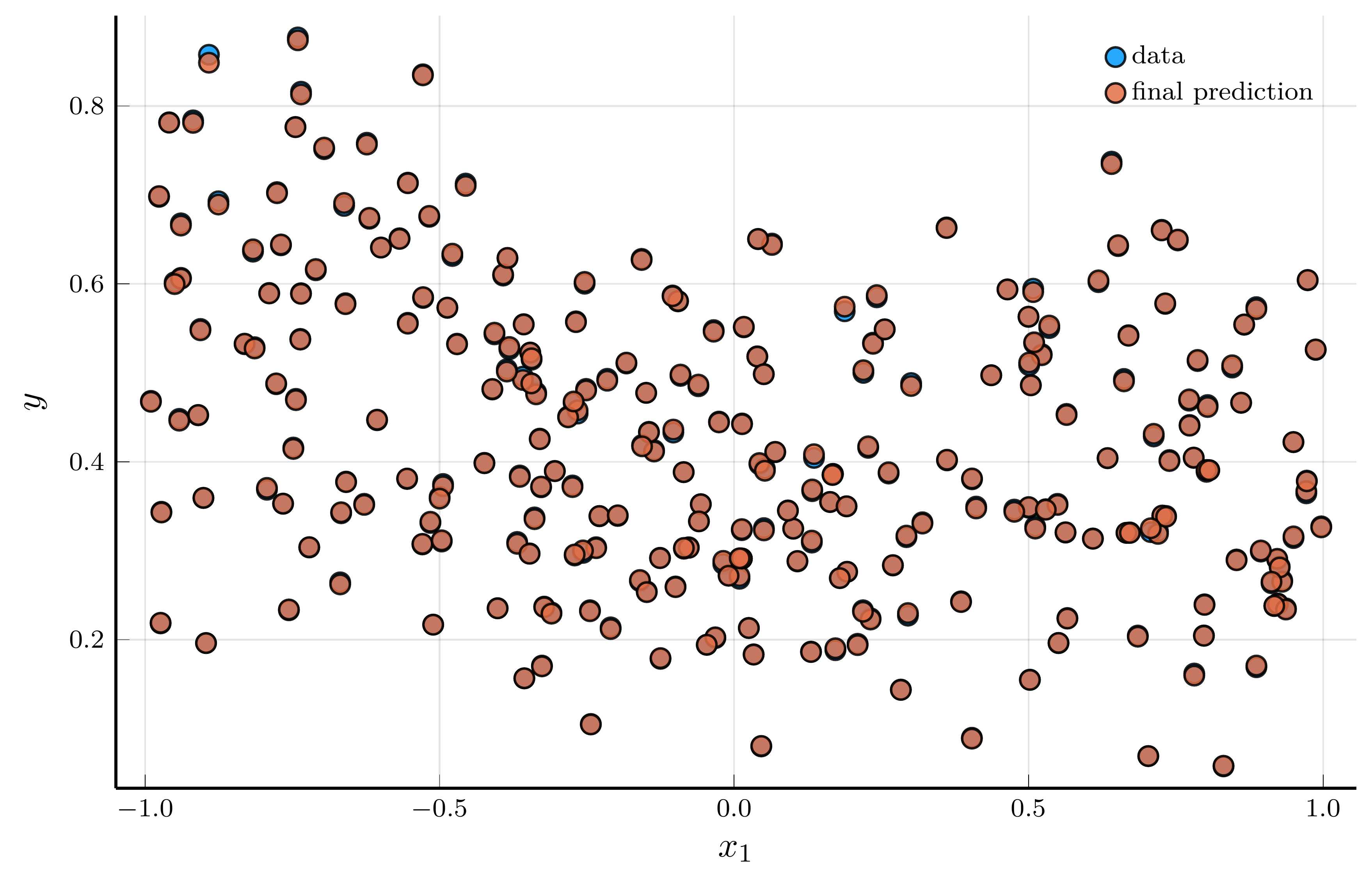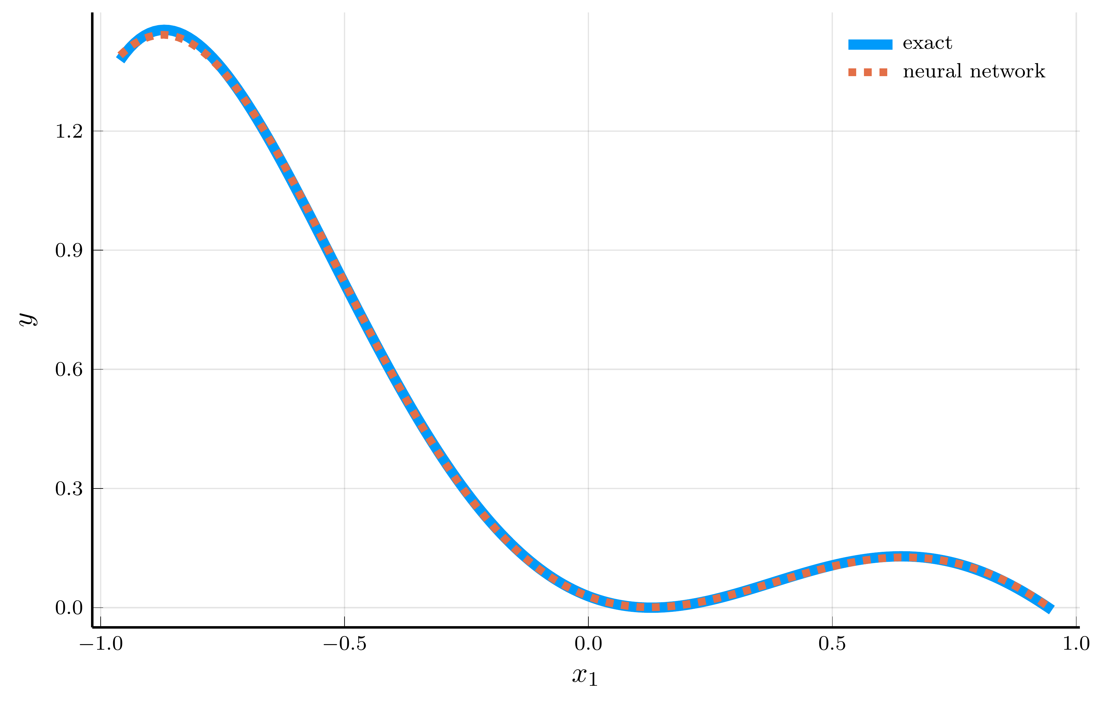 y_samples = [f(x_samples[:,i]) for i = 1:sample_size]'We define a DNN with two hidden layers of 32 units each and GELU activations.