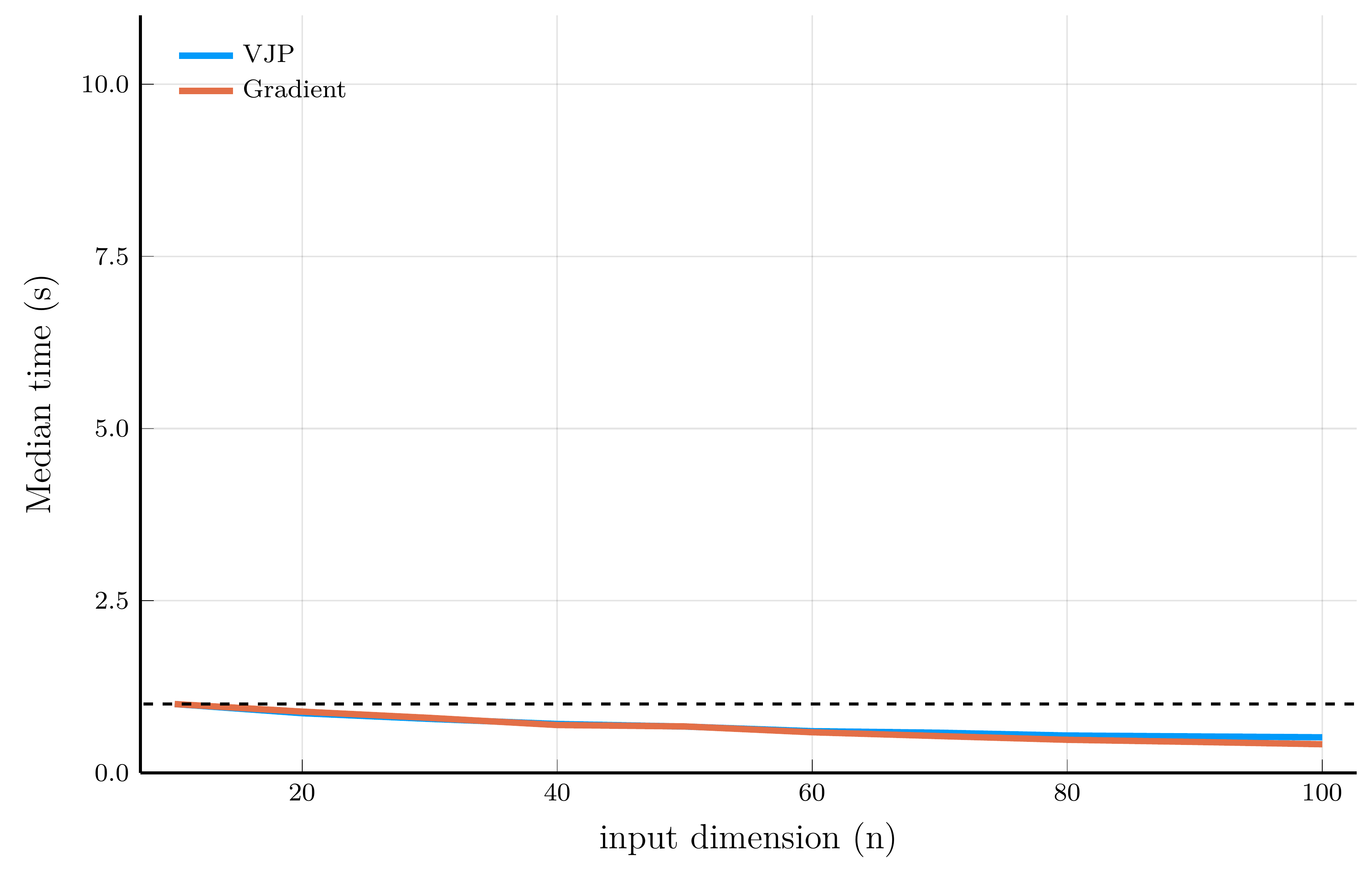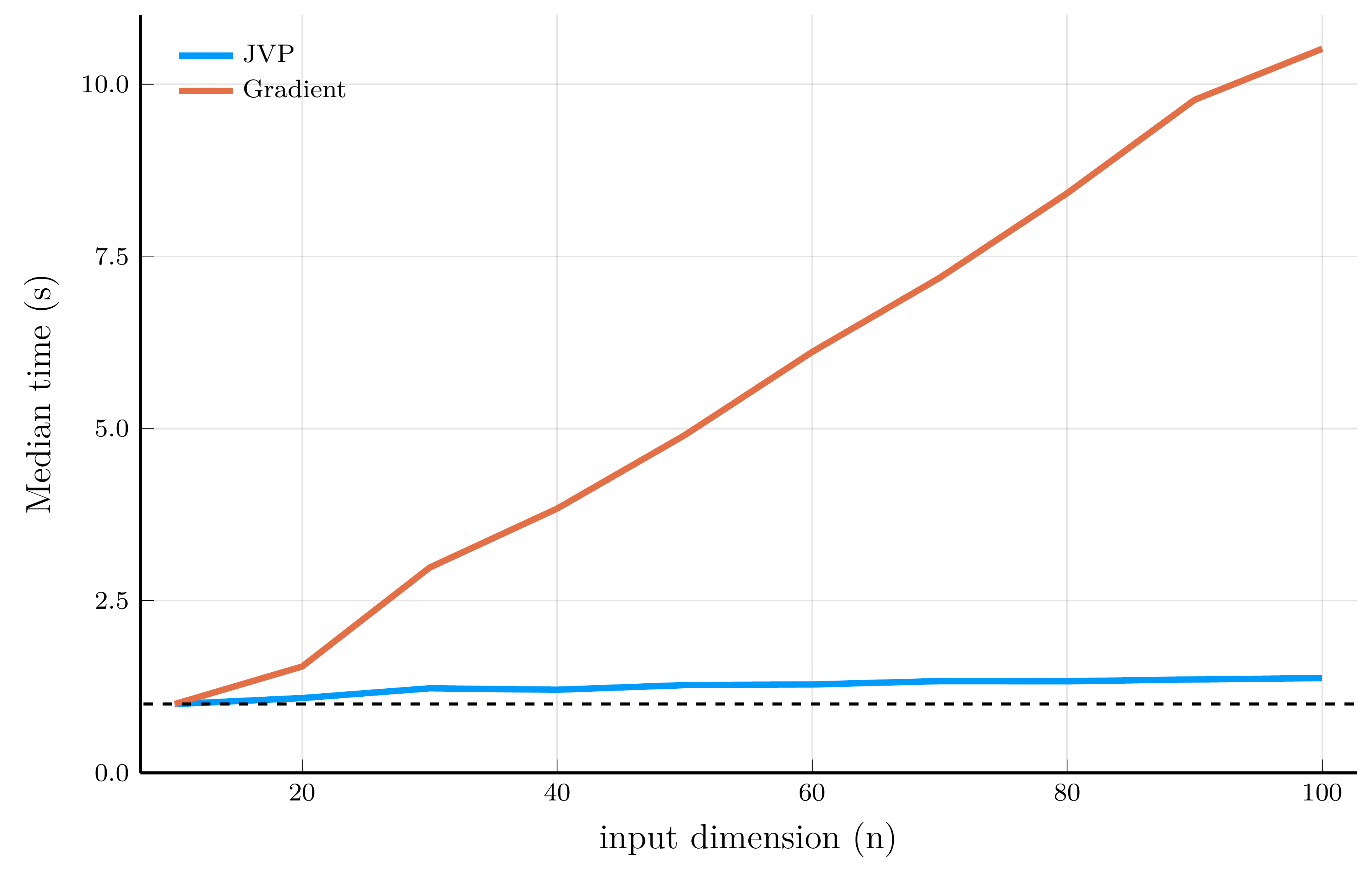For scalar-valued functions (left panel), the cost of a VJP is independent of the input dimension \(n\)
