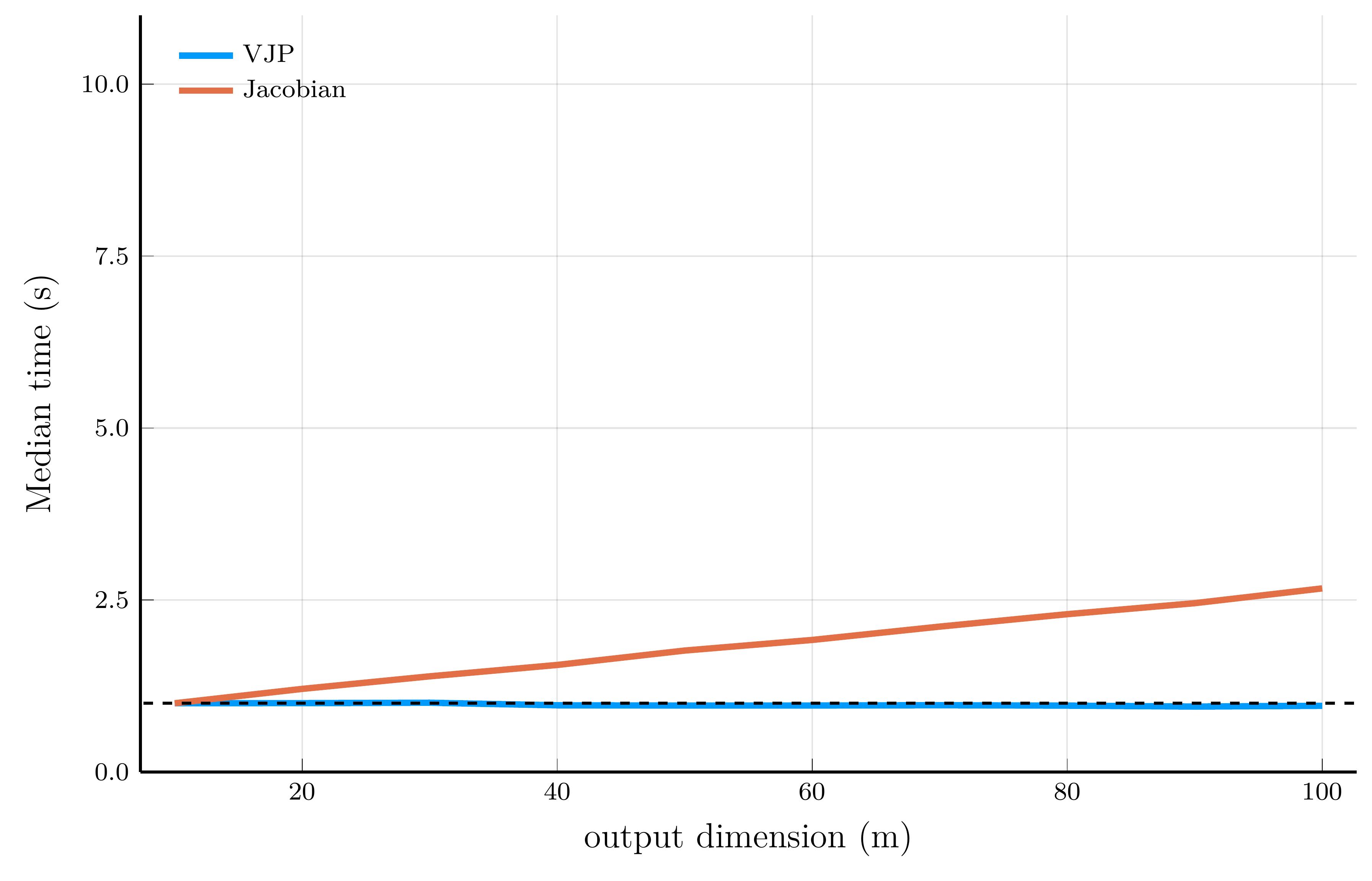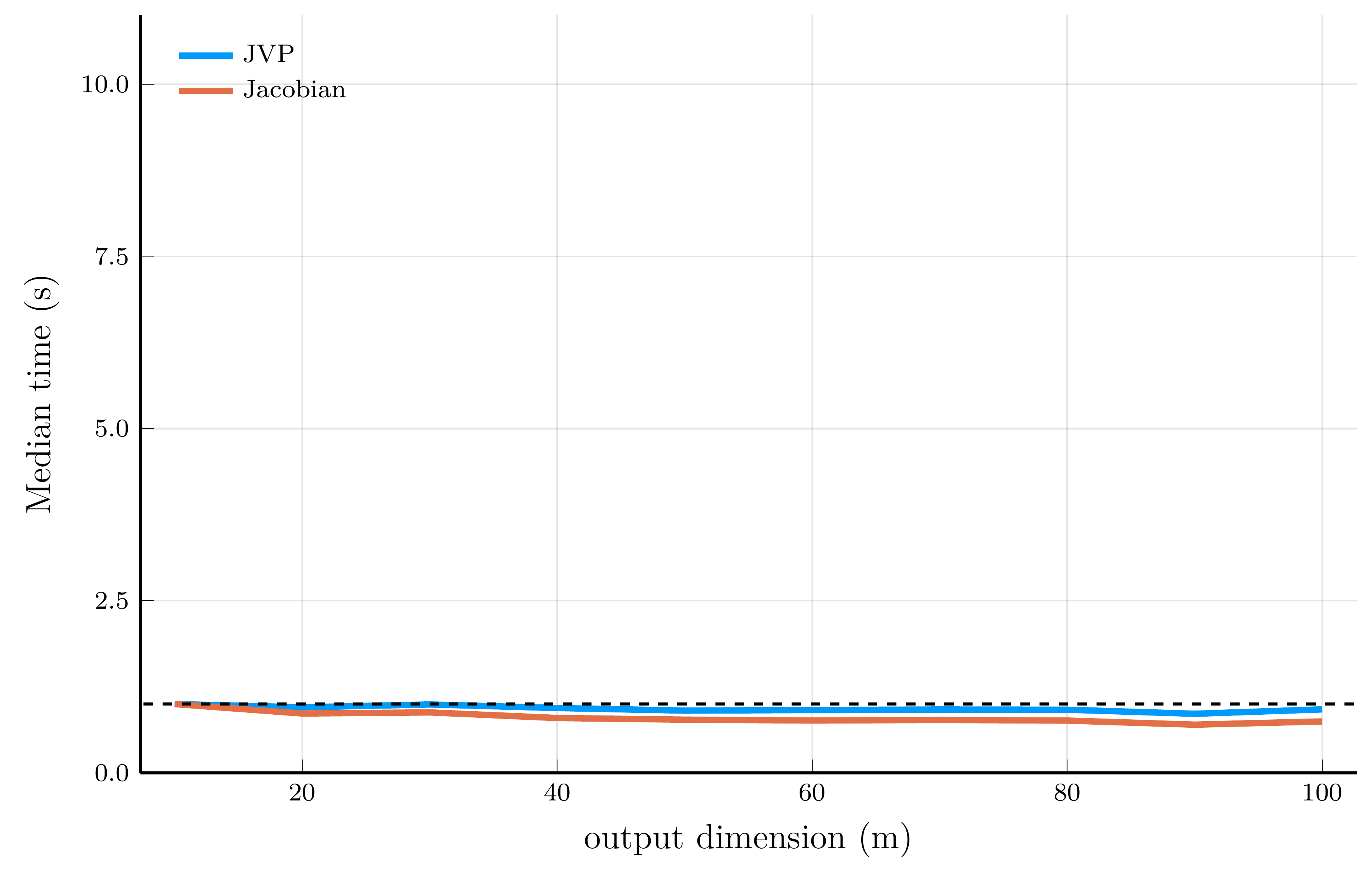 To illustrate the computational efficiency of JVPs and full Jacobians, we compare JVPs to full Jacobians on the test function \[ f_i(\mathbf{x}) = \exp\!\left(-\tfrac{1}{n}\sum_{j=1}^n \sqrt{x_j}\right) + i, \qquad \qquad \mathbf{f}(\mathbf{x}) = \big[f_1(\mathbf{x}), \ldots, f_m(\mathbf{x})\big]^\top \in \mathbb{R}^m. \]
