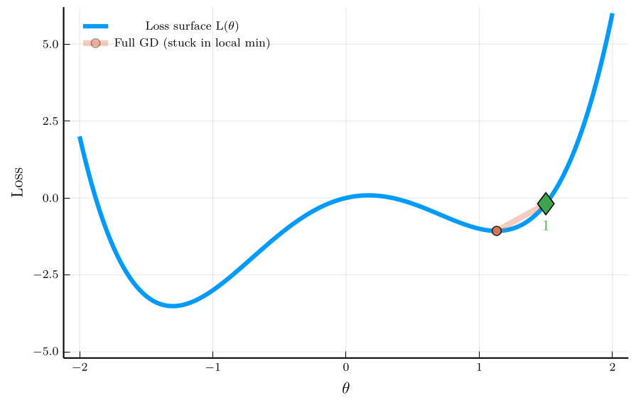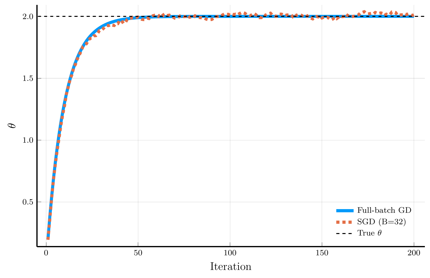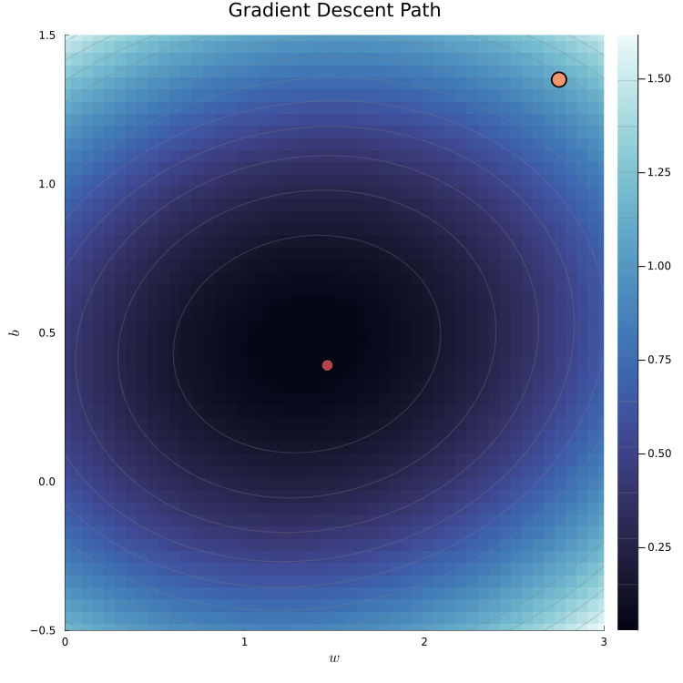w_path, b_path =Float64[θ₀[1]], Float64[θ₀[2]] # initial values